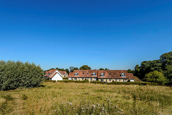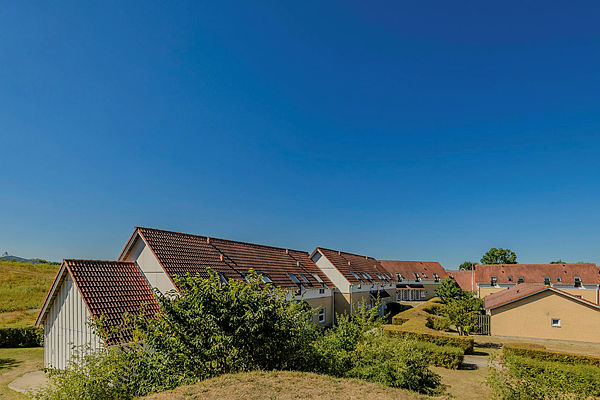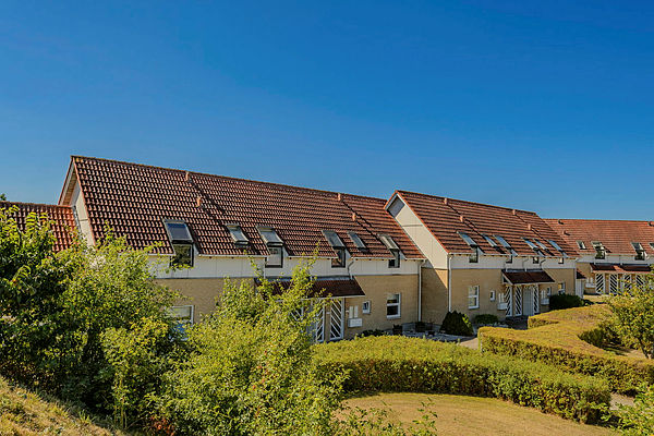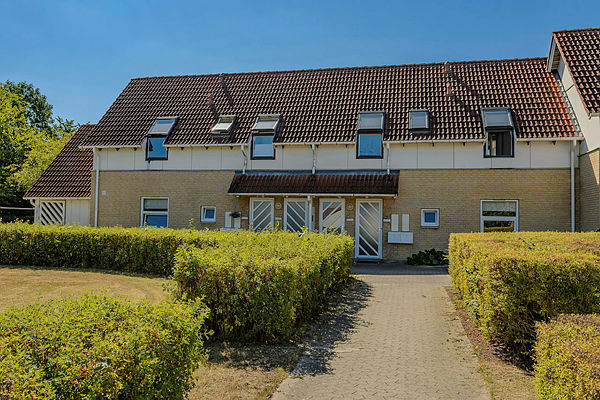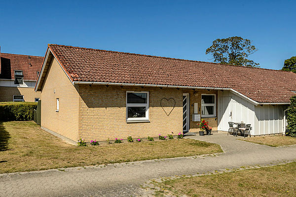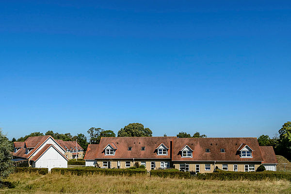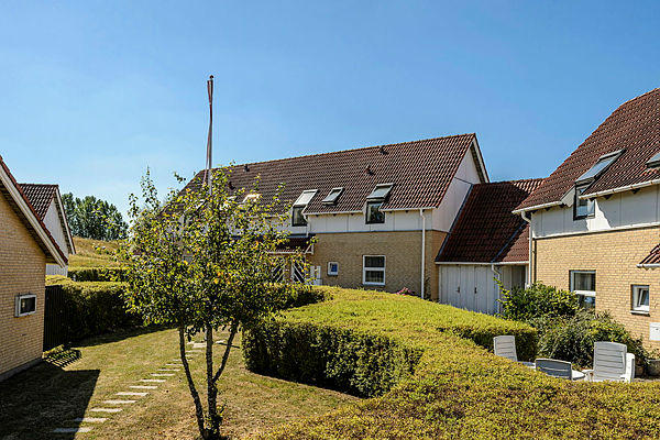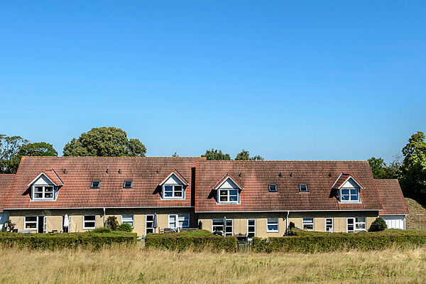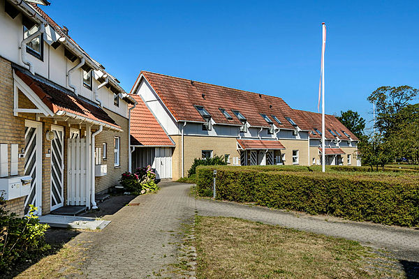 Husene er opført i gule mursten med hvide vinduer og brunt tegltag - til hver bolig er der et udhus.